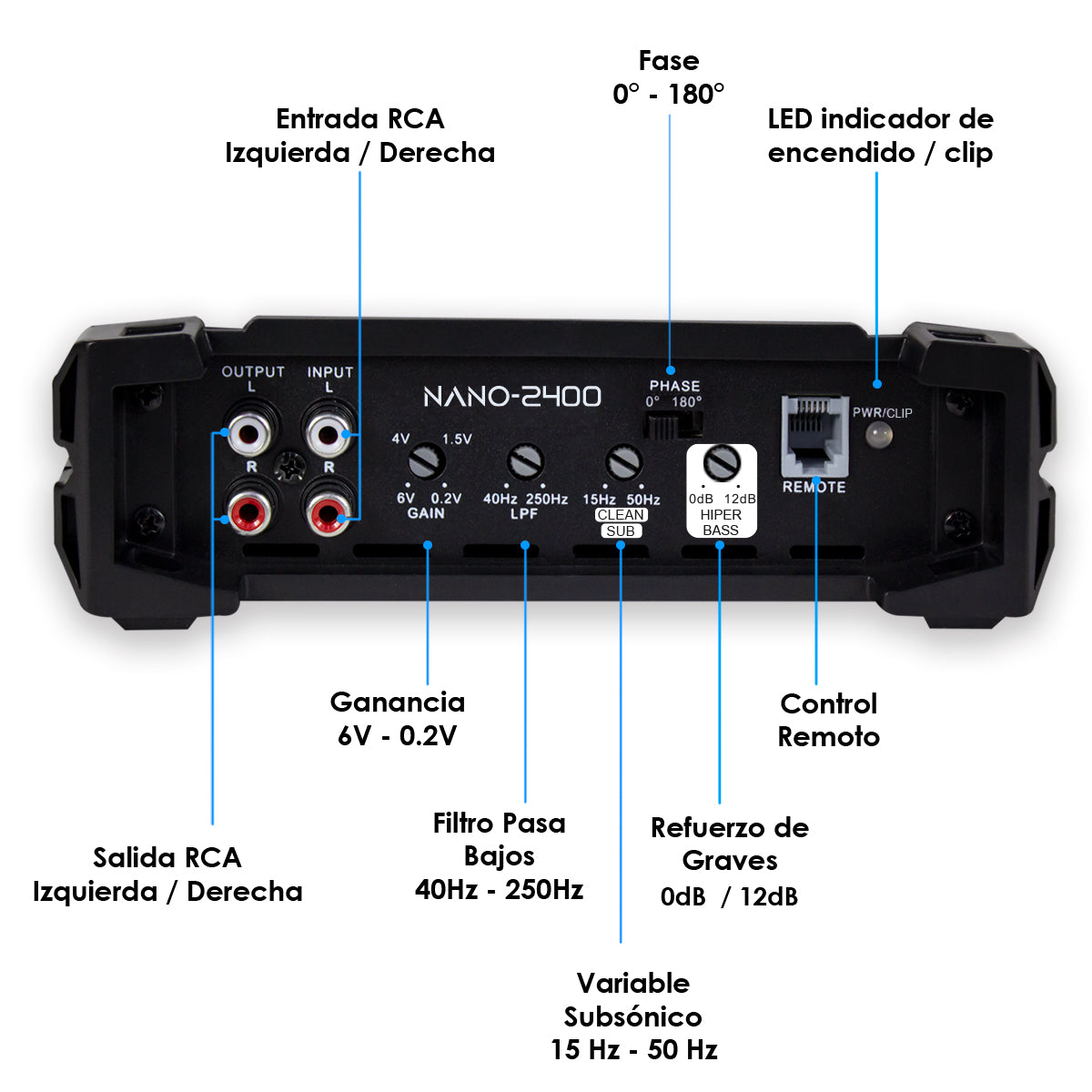 Amplificador Nano 2400 Clase D Steelpro para Subwoofer Monoblock Bass 2400W MAX 1 Ohm estable Alto Rendimiento Open Show, LPF, Bass Boost 12 dB,Filtro Subsonico, Fase Variable, Control de Bajos