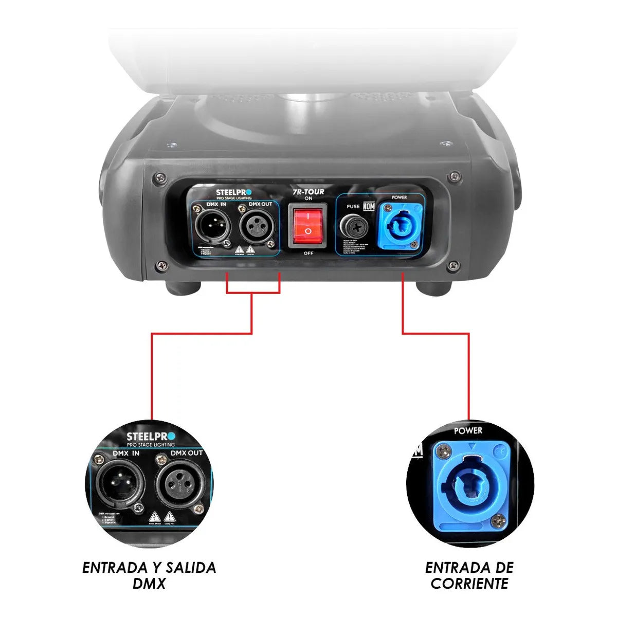 --- STEELPRO ---- NUEVO MODELO 7R-TOUR --- Beam 230W Kit de 2 cabezas motorizadas 7R Efecto RAINBOW •Prisma Rotatorio •15 colores monocromáticos + medios colores •Disco de 10 Gobos + 4 Dicroicos •Prisma Rotatorio RAINBOWN de 24 Caras •Prisma Rotatorio de 48 Caras •4 modos de control estándar: compatible con DMX512, esclavo maestro, activación por sonido, control de funcionamiento automático. •Patrón de Gobos y color cambiable: el sensor de sonido permite controlar el color y los Gobos con sonido y/o música. •Rendimiento estable: permite movimientos rápidos, suaves y precisos. •Fácil de usar e instalar: con soporte de montaje para colgar, instalar en una pared o poner en el suelo. •Con posición totalmente ajustable, así como un efecto estroboscópico para presentar una iluminación impresionante y creativa adecuada para fiestas y espectáculos. •Funciona a través de programas automáticos integrados, Auto, sonido y control DMX •El diseño incorpora 2 motores individualmente. La cabeza es capaz de girar a 540° de paneo y 270° de tildeo. Puede establecer el modo de movimiento X/Y y secuencias de entrada a través de un controlador DMX. ESPECIFICACIONES Potencia: 230 watts Control: DMX512/ Maestro/Esclavo/Audiorítmico/Automático 16 Canales para DMX Pantalla: LED con controlador de fácil uso Conexión: POWERCON Incluye: - 2 Cabezas móviles 7R TOUR - Case de Uso rudo Para Transportación - 2 Cables de alimentación - 2 Cables DMX - 2 Soportes para montaje - Manual de usuario Envíos a toda la República Mexicana. Facturamos sin costo el día de la compra. Horarios de atención y envíos: Lunes a viernes a partir de las 09:00 - 18:00 pm. Sábados a partir de las 09:00 a 14:30 pm. STEELPRO ¡El mejor precio!