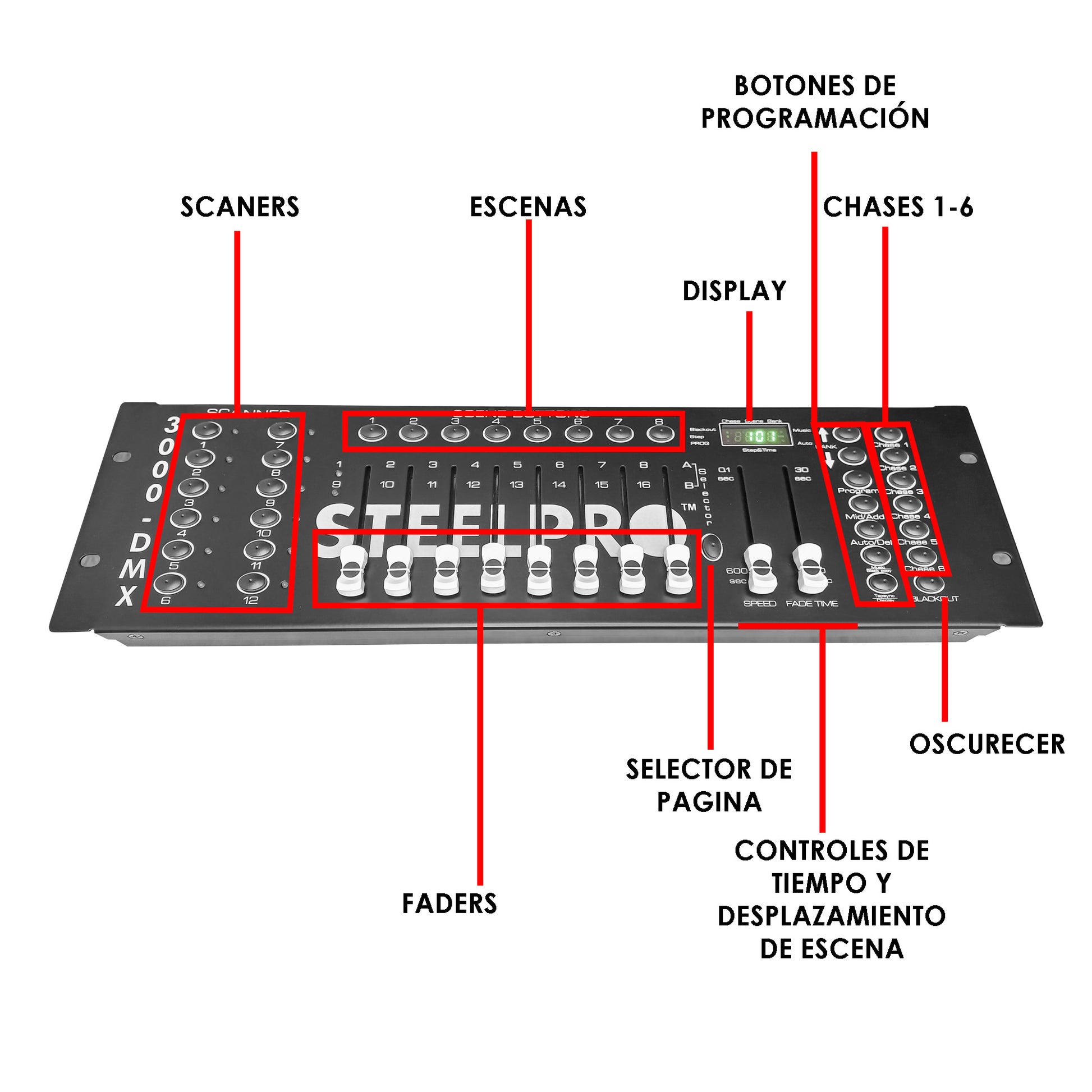 La consola de iluminación te puede llevar fácilmente a través de la programación, reproducción y manipulación en vivo de escenas y presentaciones. Ideal para bandas, bares, pubs, clubes, fiestas, bodas, etc.