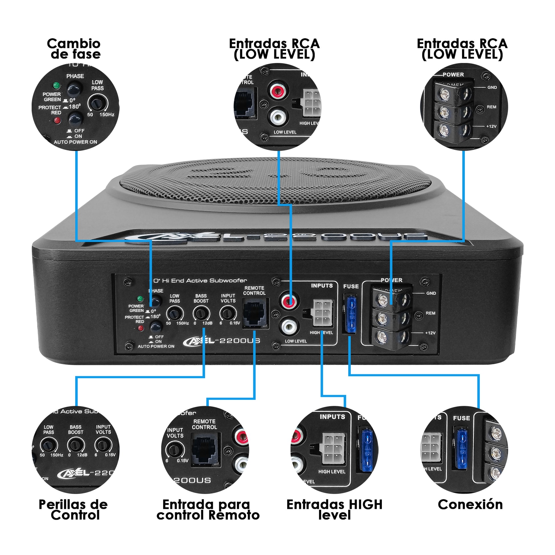 BENEFICIOS CLAVE - Sistema activo + pasivo - Amplificador monoaural MOSFET integrado – 700W RMS reales - Diseño compacto y oculto (ahorra espacio en la cajuela puedes utilizarlo debajo del asiento ) - Auto Power ON (encendido automático por señal) - Control remoto con cable incluido - Excelente disipación de calor (aluminio fundido) - Sonido potente sin distorsión AJUSTES PROFESIONALES DE AUDIO Control de Fase 0° / 180° Alinea los graves según la posición del subwoofer para mejor percepción sonora. Filtro LOW PASS (50Hz – 150Hz) - 50Hz bajo profundo - 80Hz balance ideal recomendado - 150Hz bajo firme y seco Bass Boost (0 – 12 dB) - Refuerza los graves en la frecuencia seleccionada (uso recomendado tras calibración). - Control de Ganancia (0.15 – 6V) Permite ajustar el nivel exacto para un sonido potente sin distorsión. - Auto Power ON (HI LEVEL) El subwoofer se enciende automáticamente al detectar señal de audio. - Control Remoto con Cable (Incluido) Instálalo bajo el tablero para ajustar el nivel de graves de forma segura. ESPECIFICACIONES TÉCNICAS - Potencia RMS: 2 x 350 W - Potencia Máxima: 2 x 850 W - Entradas: RCA de alto nivel - Ganancia: 0.15 – 6 V - Fase: 0° / 180° - Bass Boost: 0 – 12 dB - Low Pass: 50 – 150 Hz - THD: 0.05% - Sensibilidad: 91 dB - Respuesta de Frecuencia: 20 – 150 Hz - Impedancia: 4 + 4 ohms - Voltaje: 12V LA MEJOR OPCIÓN EN SUBWOOFERS PARA AUTO Potencia, control y calidad profesional en un solo equipo. Compra ahora y transforma el sonido de tu vehículo.
