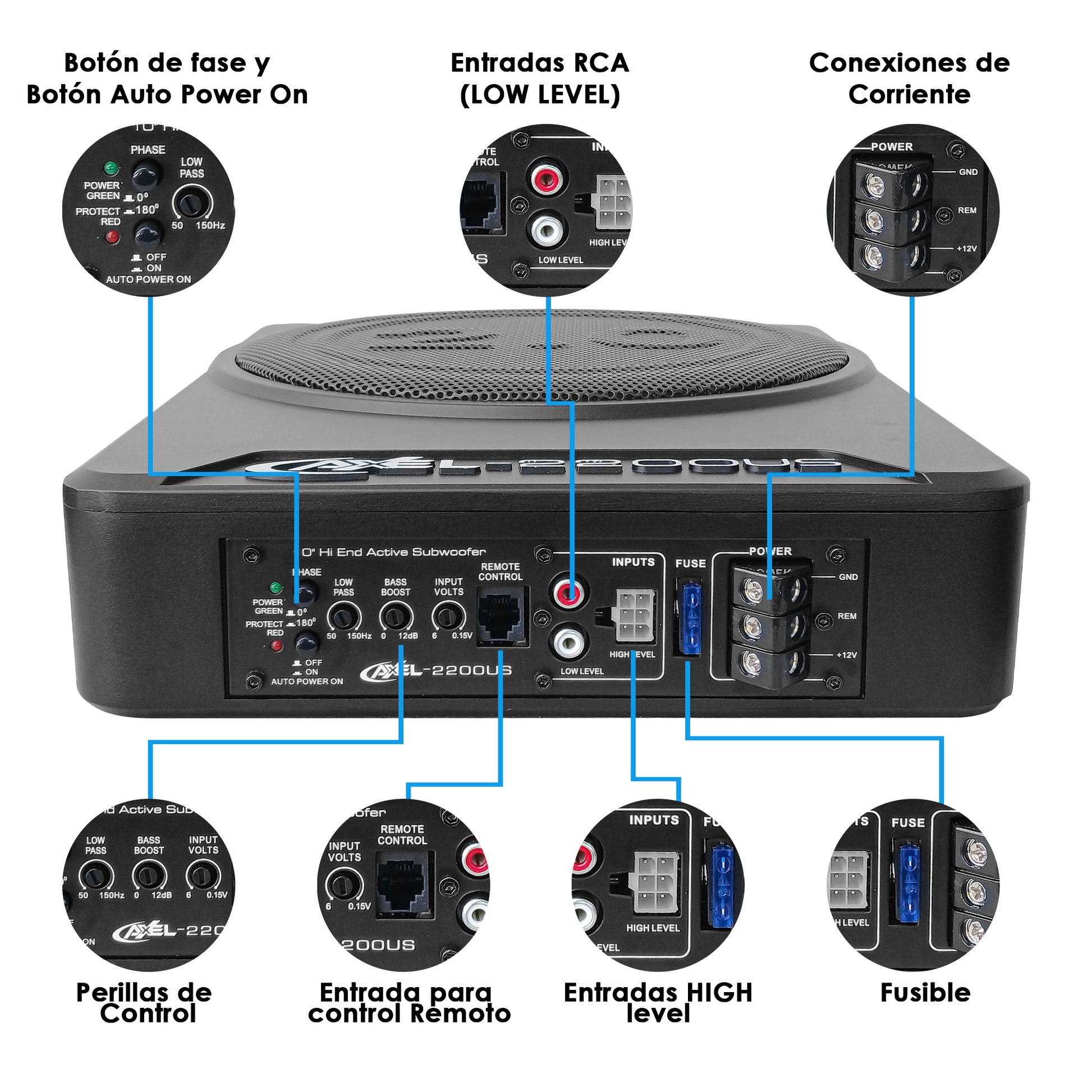 Subwoofer Bajos Doble Amplificado 10 Pulg Activo + Pasivo Para Auto/Camioneta 700W RMS /1700W MAX , Control tablero , Crossover/ Bass Bost / Amplificador Mosfet Integrado / Bajo Profundo Axel Steelpro