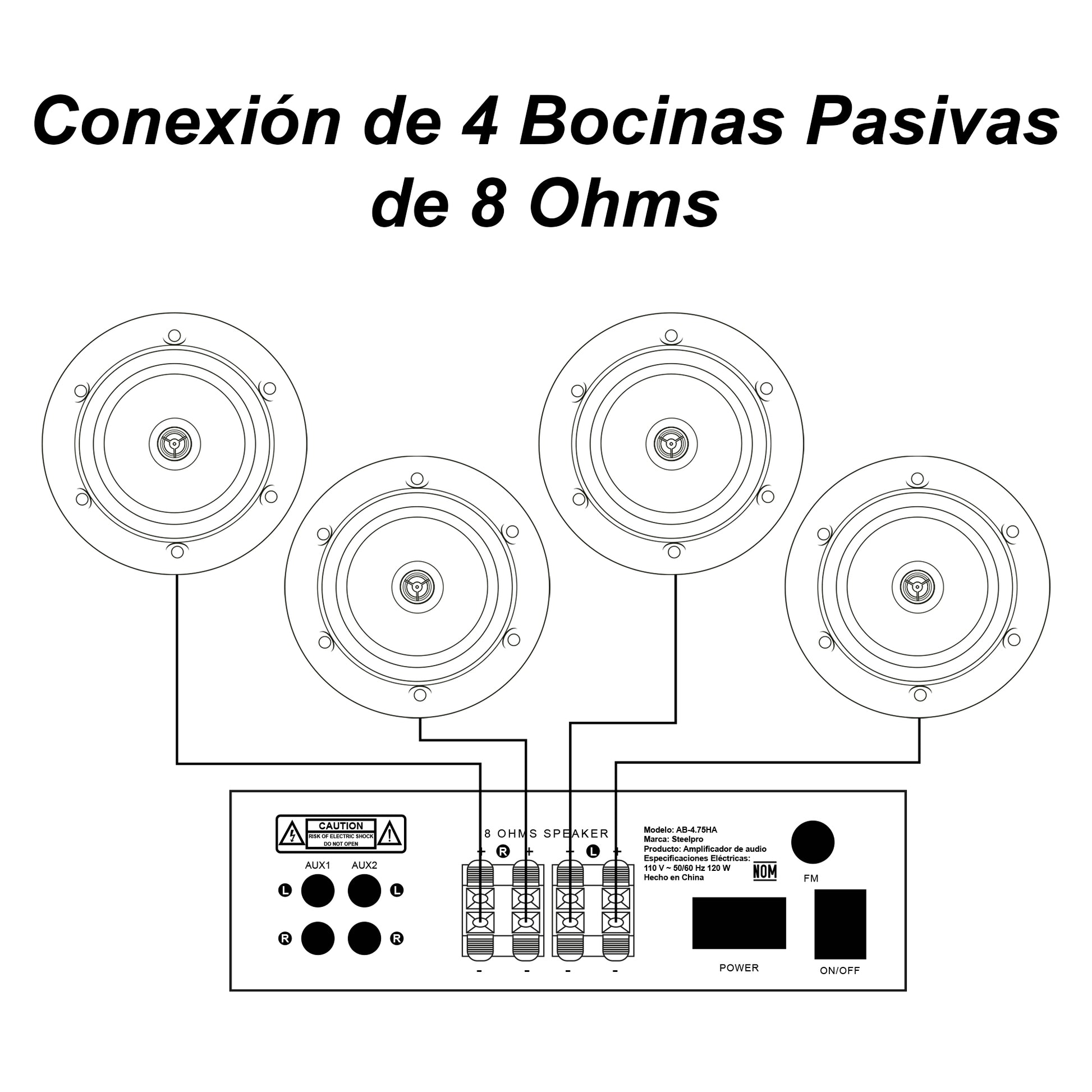 Este amplificador permite conectar 4 bocinas pasivas de 8 Ohms