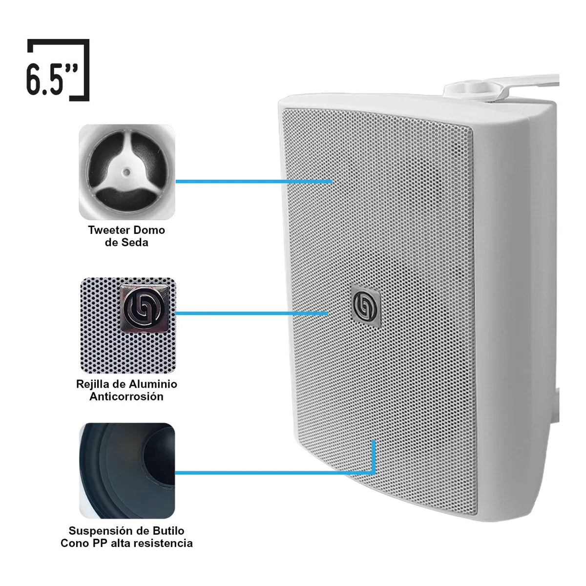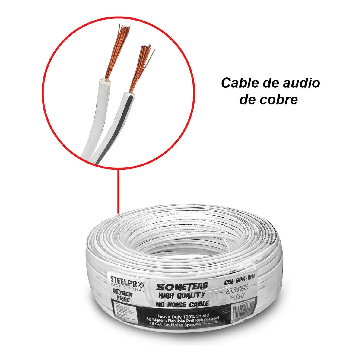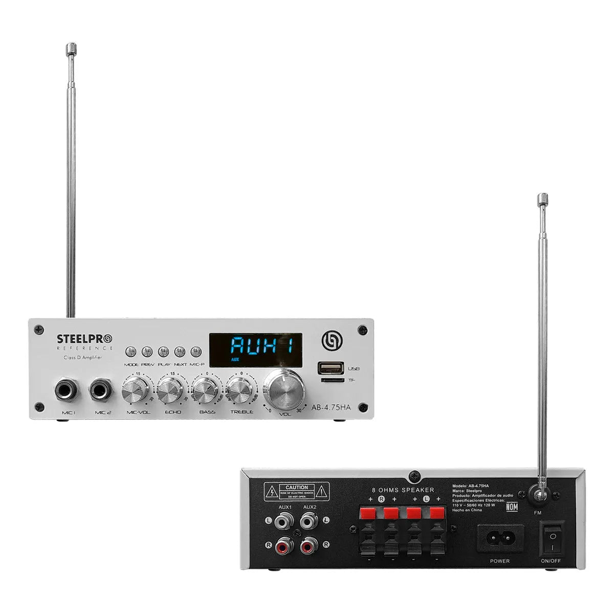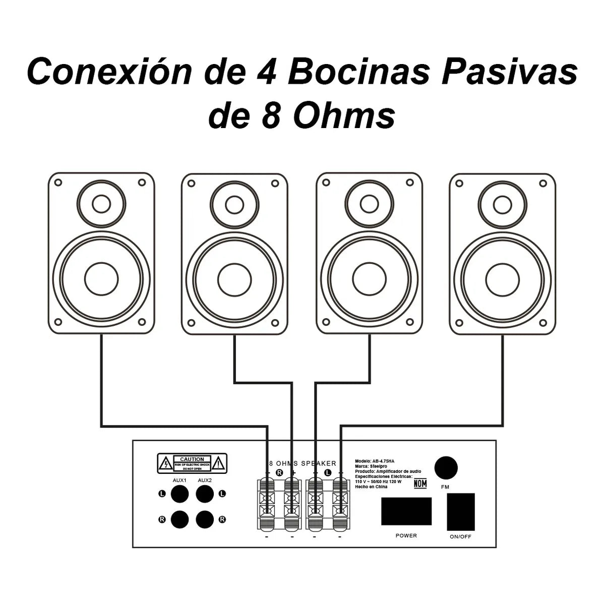 -- STEELPRO Kit Amplificador para casa o negocio 300W Conexión de 4 Bocinas de 8 ohms incluye cable de 50m para instalación.-- Bocinas con rejilla ANTICORROSION y Tweeter de Seda diseñadas especialmente para ofrecer un sonido envolvente y de alta calidad El sistema cuenta con Bluetooth, USB, TF ,FM , Aux 1 y 2 , 2 entradas de Micrófono. Este amplificador permite conectar 4 bocinas pasivas de 8 Ohms Este kit STEELPRO está diseñado para ofrecer una experiencia de audio excepcional en el hogar o negocio el paquete esta disponible con bafles de 6.5 pulgadas en dos colores BLANCO Y NEGRO . ESPECIFICACIONES Amplificador - Rango de Entrada de Potencia AC 110 V - 240 V - Potencia nominal: 300W (4 X 75W) - Impedancia de salida: 8 OHMS - Entradas USB / TF / BT / 2 MIC / AUX 1 / AUX 2 / - Distancia de Transmisión BT 10 Metros - 4 Salidas Pasivas de Bocinas ESPECIFICACIONES Bafle ambiental Color Negro y blanco Rejilla de Aluminio Anti corrosión Tweeter Domo de Seda Bocinas 6.5’’ Impedancia: 8 Ohms Frecuencia: 60 Hz - 20 KHz Sensibilidad: 92 dB (1w/m) INCLUYE - 4 pz Bafles Ambiental Reja Anticorrosión 6.5 Steelpro - Control Remoto - 1 rollo de cable 50M calibre 18 Steelpro Es crucial configurar correctamente la impedancia y usar solo bocinas de 8 Ohms en conección de 4 bocinas para evitar daños al amplificador. Envíos a toda la República Mexicana. Facturamos sin costo el día de la compra. Horarios de atención y envíos: Lunes a viernes a partir de las 09:00 - 18:00 pm. Sábados a partir de las 09:00 a 14:30 pm. STEELPRO ¡El mejor precio