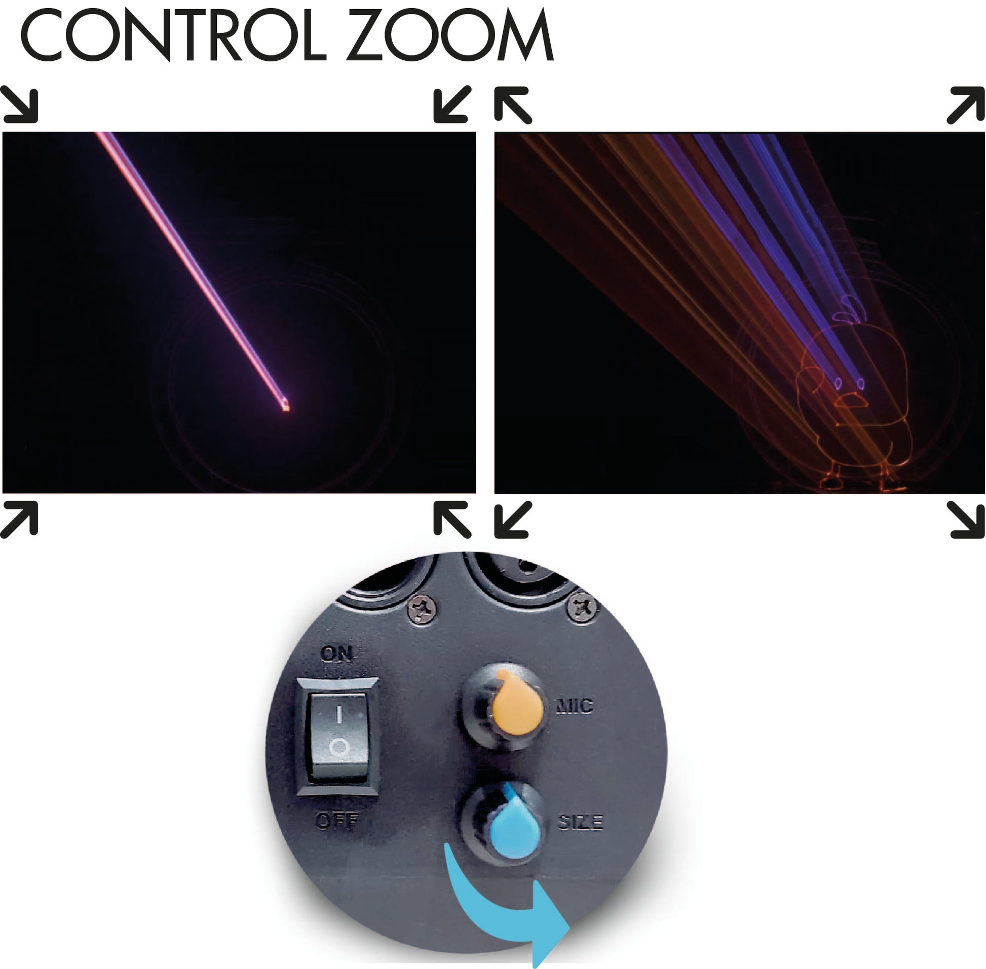 Además, con su Control ZOOM/SIZE integrado podrás ajustar el tamaño de los patrones, adicional cuenta con control de sensibilidad de sonido que harán tus eventos más divertidos.