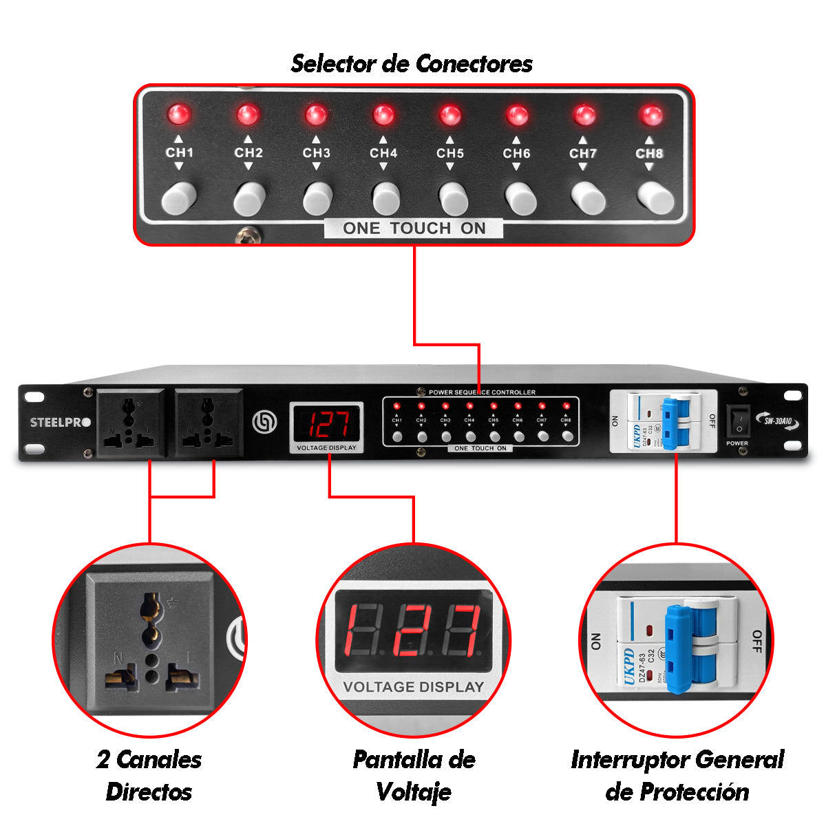 Rack Multicontacto 10enchufes Supresor De Picos 32a Steelpro Color Negro