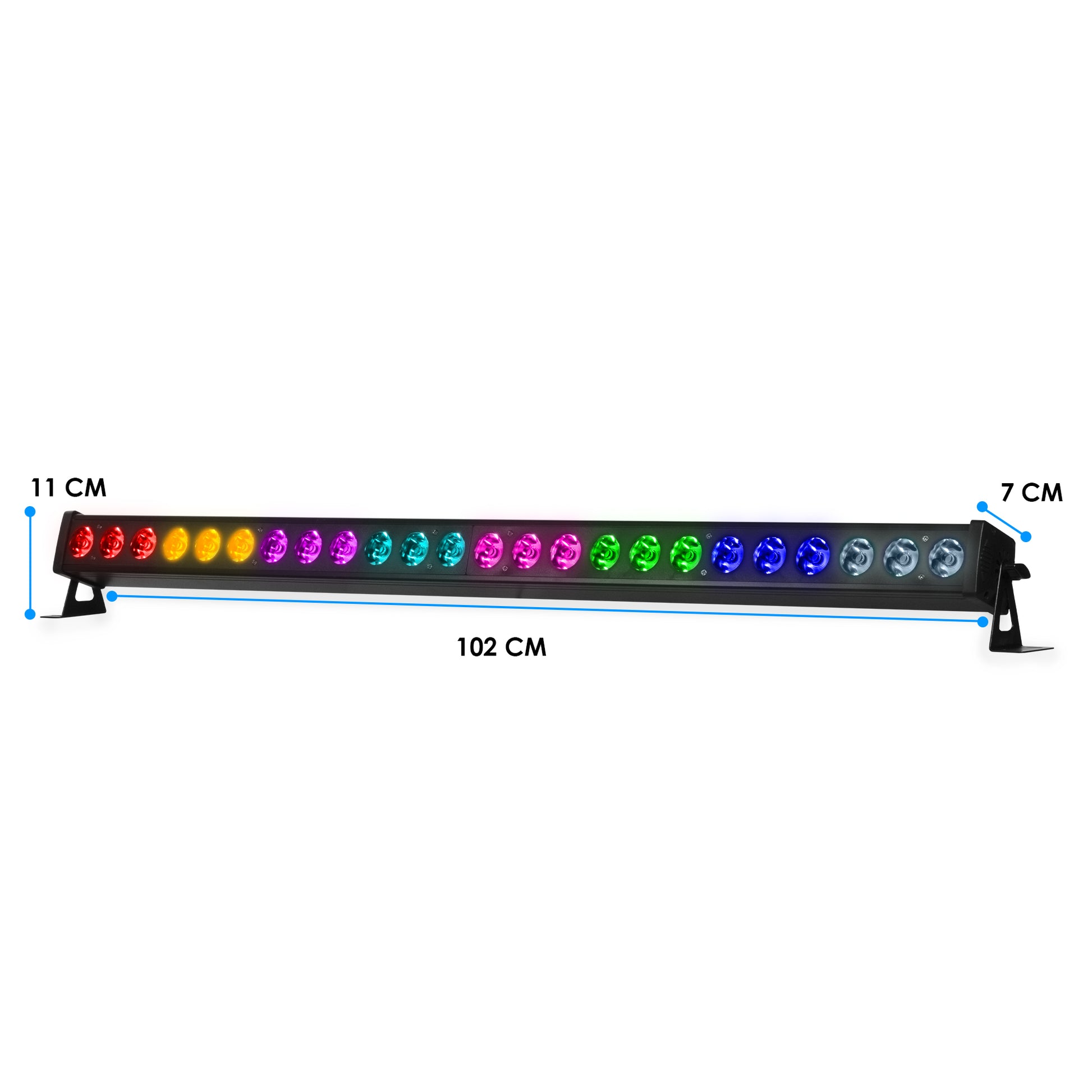 El corazón de este equipo reside en sus 24 LEDs de 5 Watts cada uno, lo que suma una potencia total de iluminación robusta. Gracias a su tecnología RGB Full Color, la barra permite una mezcla de colores homogénea, permitiendo crear desde tonos pastel suaves hasta colores primarios saturados y vibrantes. Su óptica está optimizada para generar el efecto Beam, caracterizado por haces de luz concentrados que cortan a través de la atmósfera, especialmente efectivos cuando se utilizan con máquinas de humo o niebla.